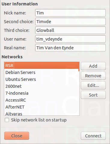 4. Vul dan de info in die hierboven staat. Onder "Nickname" vul je in onder welke naam je op de chat wil zitten. Het is makkelijk als dit je RS(R)-naam is, maar dit hoeft niet. Ikzelf gebruik meestal gewoon "Tim". Onder "Auto join channels" hoef je niets te zetten. Wanneer je verbinding maakt met onze server, join je automatisch ons hoofdkanaal, #RSR. Als je wil, kun je hier andere channels aan toevoegen, zoals #Trivia.