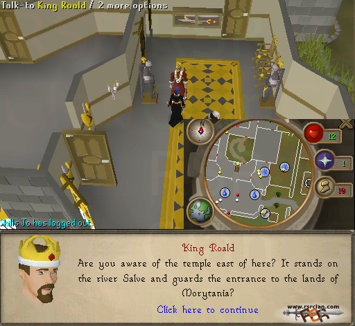 Lengte: Gemiddeld Moeilijkheid: Gemakkelijk Skills nodig: Je moet in staat zijn om een level 30 Temple Guardian te verslaan. Quests nodig: Geen Items nodig: 50 Rune/Pure Essence en een Bucket. Startpunt: King Roald, in Varrock Palace |